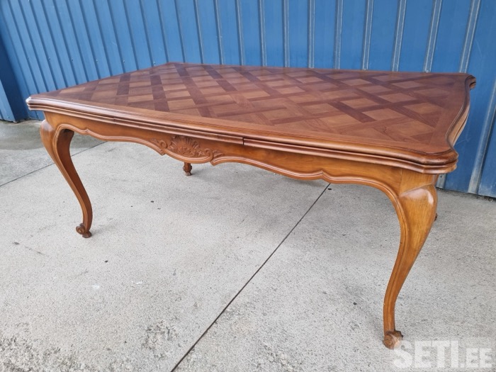 Здравствуйте Мы продаем мебель и декор из Франции со склада в Нарве. В наличии стол из массива черешни, в отличном состоянии, так же в комплекте 2 удлинителя по 50см каждый, которые убираются в стол. Так же к столу есть возможность купить комплект стульев.