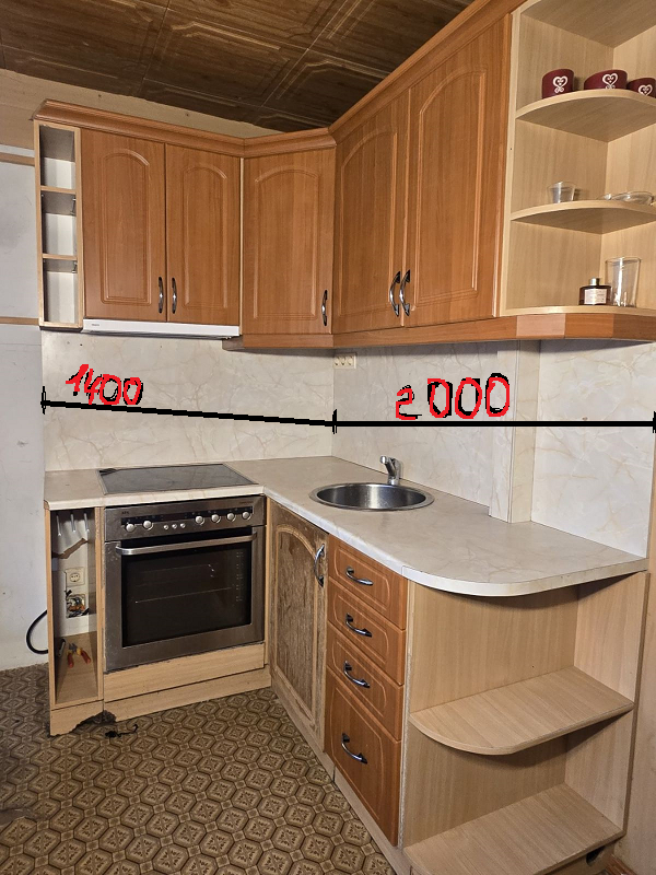 Кухню с мойкой и техникой в нормальном состоянии, имеется фартук Размер: 2000х1400 Техника: Духовой шкаф, варочная поверхность, вытяжка. В нижней части есть дефекты Возможна доставка