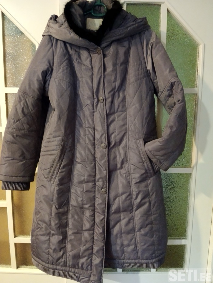 Пальто зимнее, свободного кроя, темно-серого цвета, застёжка молния с планкой на кнопках, с капюшоном, воротник с тонкой окантовкой искусственного меха черного цвета, с карманами, в рукавах манжеты с широкой резинкой, что хорошо сберегает тепло. Размер на рос.этикетке 50-51, но на самом деле 54-56, наверное даже 58 подойдёт. Можно померять.