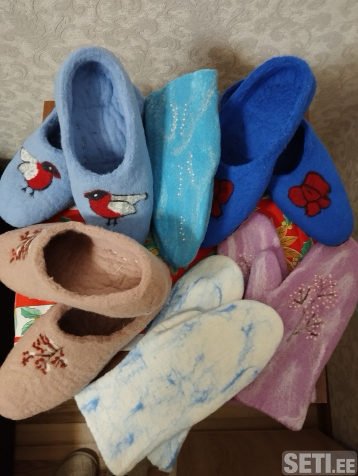 Сделаю на заказ тапочки и варежки из натуральной шерсти с набивным рисунком или без него. Прекрасный подарок на новогодние праздники. Есть готовые изделия или можно сделать на заказ. Тапочки на подошве из натуральной кожи. Тапочки плотные: 20 евро Тапочки потоньше: 15 евро. Варежки: 15 евро.