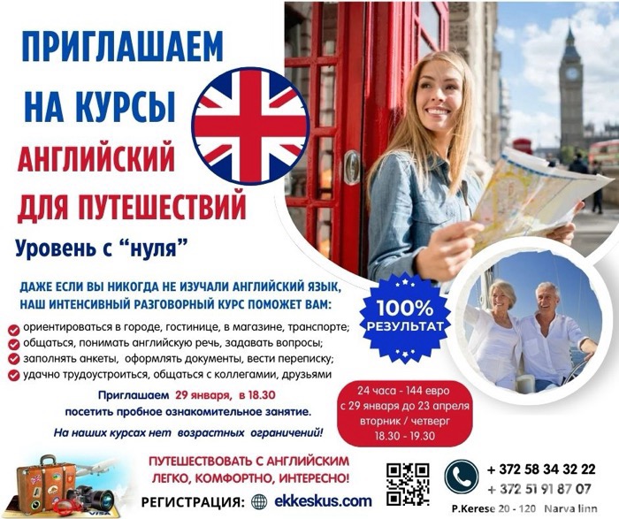 Вы начнёте говорить с 1 урока, даже если никогда не изучали английский язык! Ваше путешествие станет комфортным, увлекательным - наверняка у многих были ситуации, когда незнание языка приводило в отчаяние, и отдых не доставлял радость. Всего за 2 месяца! Пройдя наш курс Вы можете смело отправляться в путешествие! Приглашаем всех желающих 29 января, в 18.30. Приходите с другом и мы вам предоставим скидку 10%. Регистрация: www. ekkeskus. com