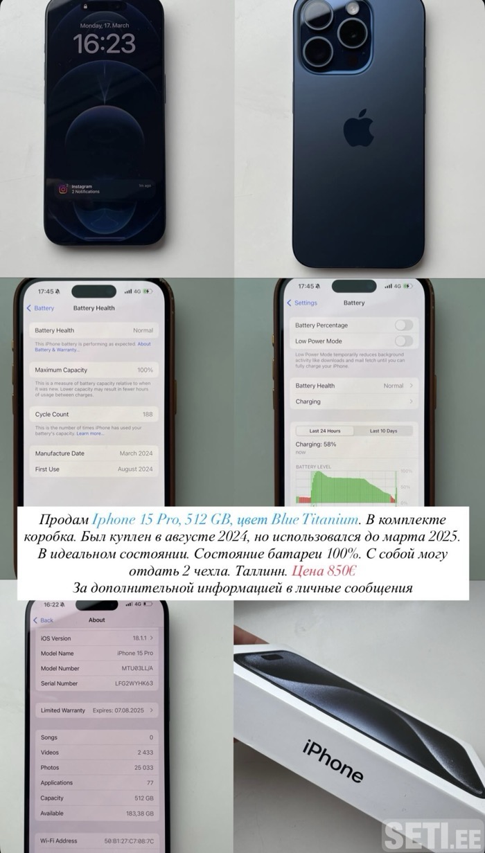 Продам Iphone 15 PRO, 512 GB, цвет Blue Titanium в идеальном состоянии. В комплекте коробка. Состояние батареи 100%. Был куплен в августе 2024 и использовался до марта 2025. С собой могу отдать 2 чехла. Дополнительная информация только через сообщения (на звонки не отвечаю).