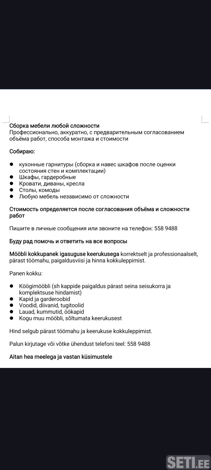 Телефон : 5589488Город : Tallinna/Mardu