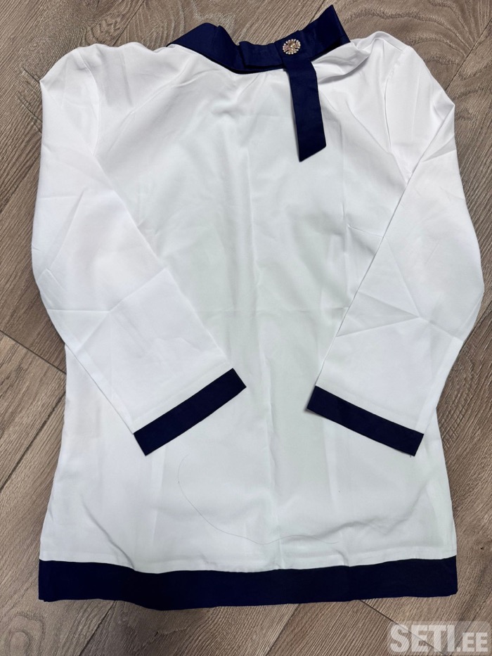 Цвет: белый с тёмно-синими вставками Длина рукава: 3/4 Декоративная брошь на воротнике Прямой крой, удобная посадка Лёгкая, приятная к телу ткань Идеальна для офиса, школы или повседневных образов. Отлично сочетается с юбками, брюками и джинсами.
