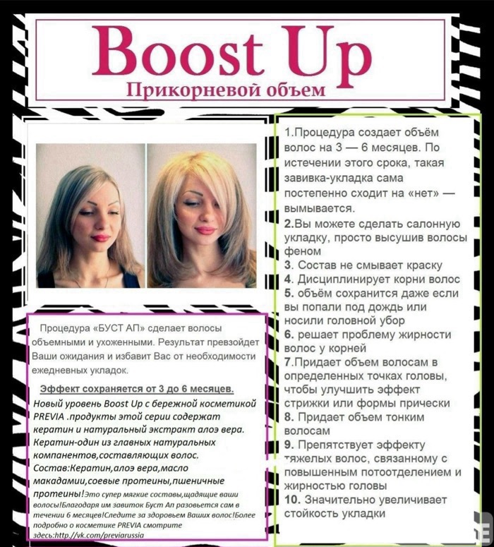 Боост Ап -это биозавивка создающая объем корней волос.Рекомендуется всем кому недостаёт объёма или волос очень быстро женится.Составы разработаны в Италии специально для этой процедуры.Очень рекомендую для стрижк таких как каре, бобкаре,для всех каскадных форм нуждающихся в объеме.Если вы давно мечтаете отрастить волосы,но считаете тонкими и редкими -это ваш шанс! Цена от 50евро