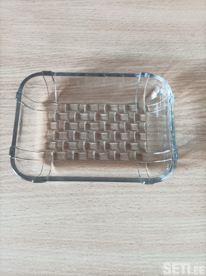 Продам винтажную прямоугольную формочку стекольного эстонского завода Tarbeklass 1980 - х годов. На дне рельефный узор , имитирующий плетение корзины. Такие изделия использовались как подставки для масла или блюдца для индивидуальных десертов.