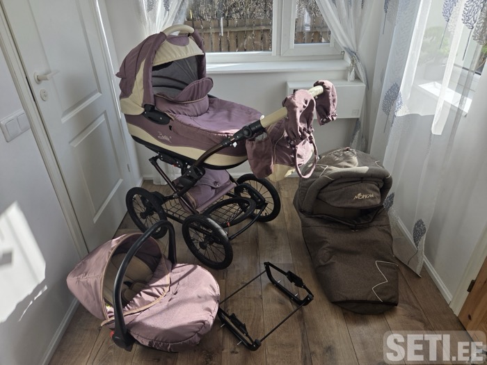 Коляска Tako 3 в 1. В комплекте маскитная сетка и дождевик. Большие надувные колёса,что позволяет проехать везде. Аккуратная и чистая, поломок нет. На шасси есть немного царапин,но на таком цвете особо не видно.