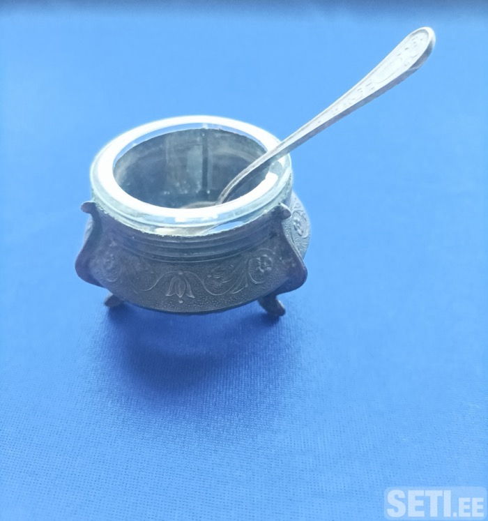 Продам винтажную солонку/горчичницу на маленьких ножках с миниатюрной ложечкой. Солонка металлическая с узором , внутри стеклянная вставка. В хорошем состоянии.