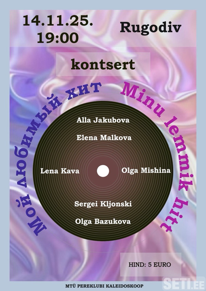 14 ноября в 19.00 в ДК "Ругодив" пройдет концерт "Мой любимый хит". Наши певцы исполнят для вас свои любимые песни из репертуара: Ани Лорак, Полины Гагариной, Анжелики Варум, Лаймы Вайкуле, Евгения Осина,Lady Gaga,Linkin park и других популярных исполнителей. В концерте участвуют: Алла Якубова, Елена Малкова,Cергей Клёнский, Лена Кава, Ольга Мишина, Ольга Бажукова Стоимость 5 евро. Билеты можно приобрести за час до концерта в ДК "Ругодив".