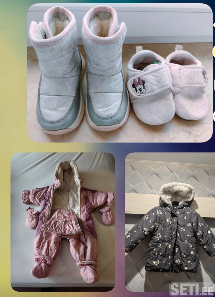 Отдам зимнюю куртку, комбез и обувь на девочку размеры: комбез 68, куртка 80, сапожки 22, Тапки 21.