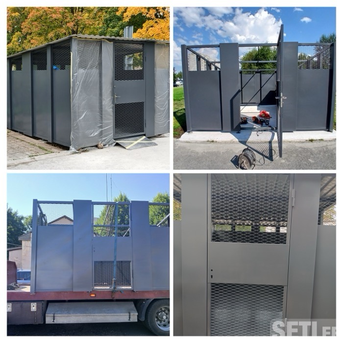 Домики для мусорных контейнеров ( 2×2,5м; 3х3м; 4х3м; 5×3м; ), предназначенные для квартирного товарищества. Размеры, цвет и различные нюансы можно подобрать индивидуально. Доставка и установка по всей Эстонии. Срок поставки 4-7 недель.