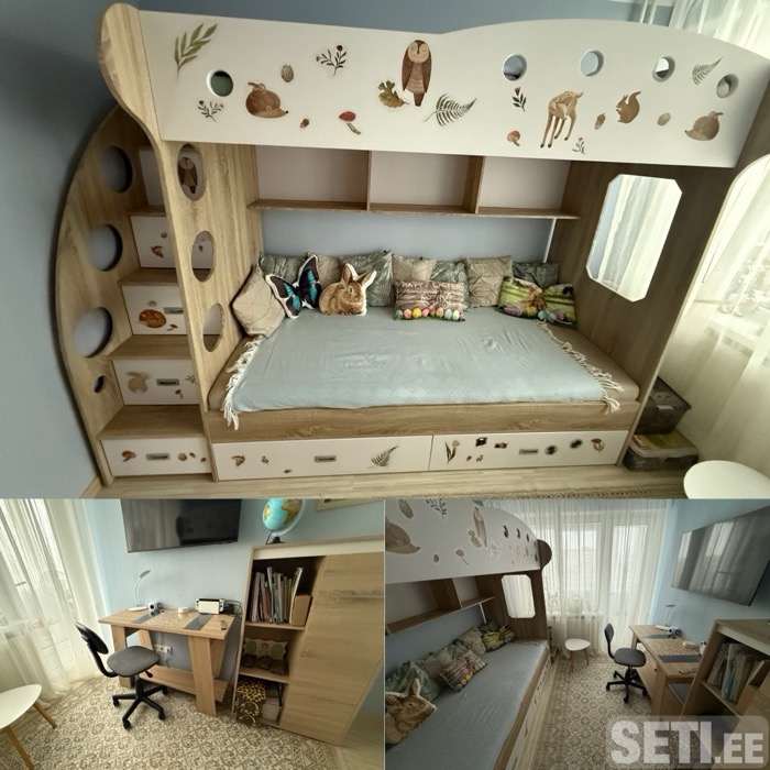 Кровать крепкая и надежная, подойдет не только для детей, но и для подростков. Много ящиков и мест хранения — отличное решение для маленькой комнаты. В комплекте 2 матраса, чистые, без пятен. Повреждений нет.