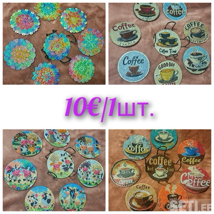 Подставки для чашек или бокалов. Алмазная живопись покрыта финишным слоем . В каждом наборе 8 подставок и держатель для них.