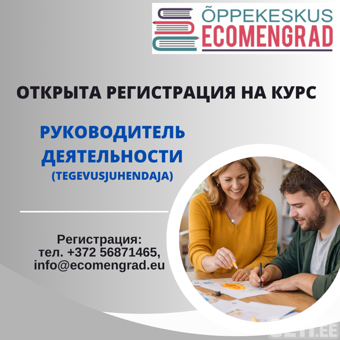 Приглашаем на курс "Руководитель деятельности (Tegevusjuhendaja)" ✅ Объем курса: 260 ак. часов Руководитель деятельности – это специалист сферы специального ухода, который руководит и поддерживает людей с особыми психическими потребностями в осуществлении ими повседневной деятельности, работы и хобби, чтобы обеспечить их максимальную самостоятельность и качество жизни. Регистрация и информация: тел. +372 56871465, info@ecomengrad.eu