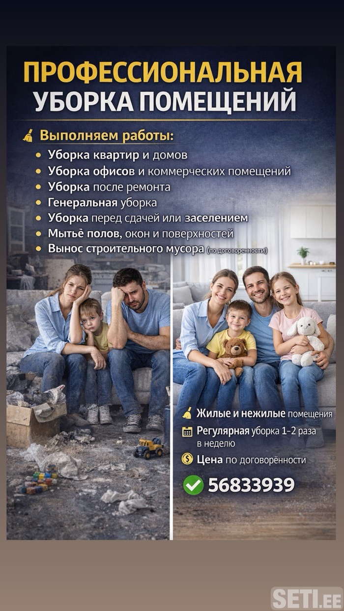 🧹 Выполняем работы: • Уборка квартир и домов • Уборка офисов и коммерческих помещений • Уборка после ремонта • Генеральная уборка • Уборка перед сдачей или заселением • Мытьё полов, окон и поверхностей • Вынос строительного мусора (по договорённости) 56833939