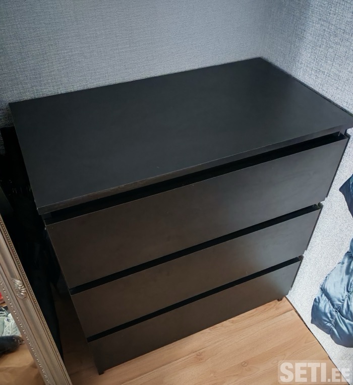 Комод с тремя выдвижными ящиками; Измерения комода: высота - 77 см, ширина - 70 см, глубина - 40 см; Корпус выполнен из ламинированной древесно-стружечной плиты (ДСП); Окантовка комода - ПВХ с высокой механической и химической стойкостью