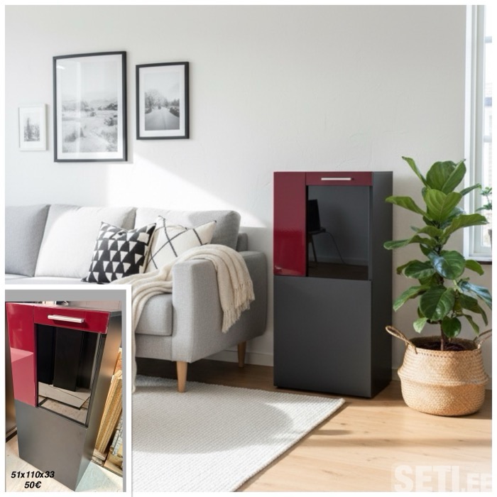 Продается компактный и элегантный шкаф-витрина в отличном состоянии. Идеально впишется в современный интерьер гостиной, прихожей или спальни благодаря минималистичному дизайну и контрастному сочетанию цветов. 📋 Характеристики: • Размеры: 51 x 110 x 33 см (Ш x В x Г) — идеальный формат «слим», не загромождает пространство. • Дизайн: Комбинация черных матовых фасадов и темного бордового глянца со стеклянной вставкой. 💰 Цена: 50€ 53622932 53637777